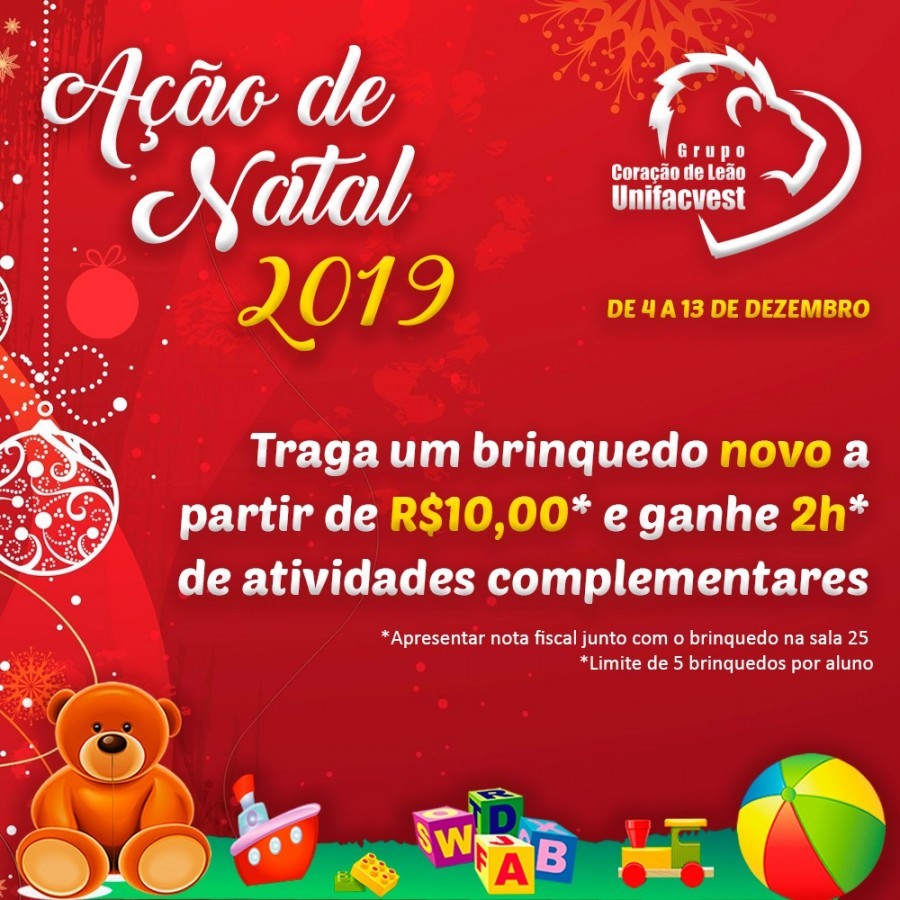 Traga um brinquedo novo a partir de R$10,00 e ganhe 2h de Atividades Complementares. Entregar o brinquedo com a nota fiscal na sala 25. Limite de 5 brinquedos por acadêmico. Válido de 4 a 13 de dezembro