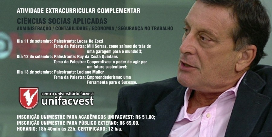 O professor de finanças e comentarista de economia do canal Globo News, Ruy Quintans, será um dos palestrantes do seminário de Ciências Sociais Aplicadas promovido pelo Centro Universitário Unifacvest entre os dias 11 e 13 de setembro. Na terça-feira (12), ele falará sobre a importância do fortalecimento das cooperativas para a sustentabilidade.