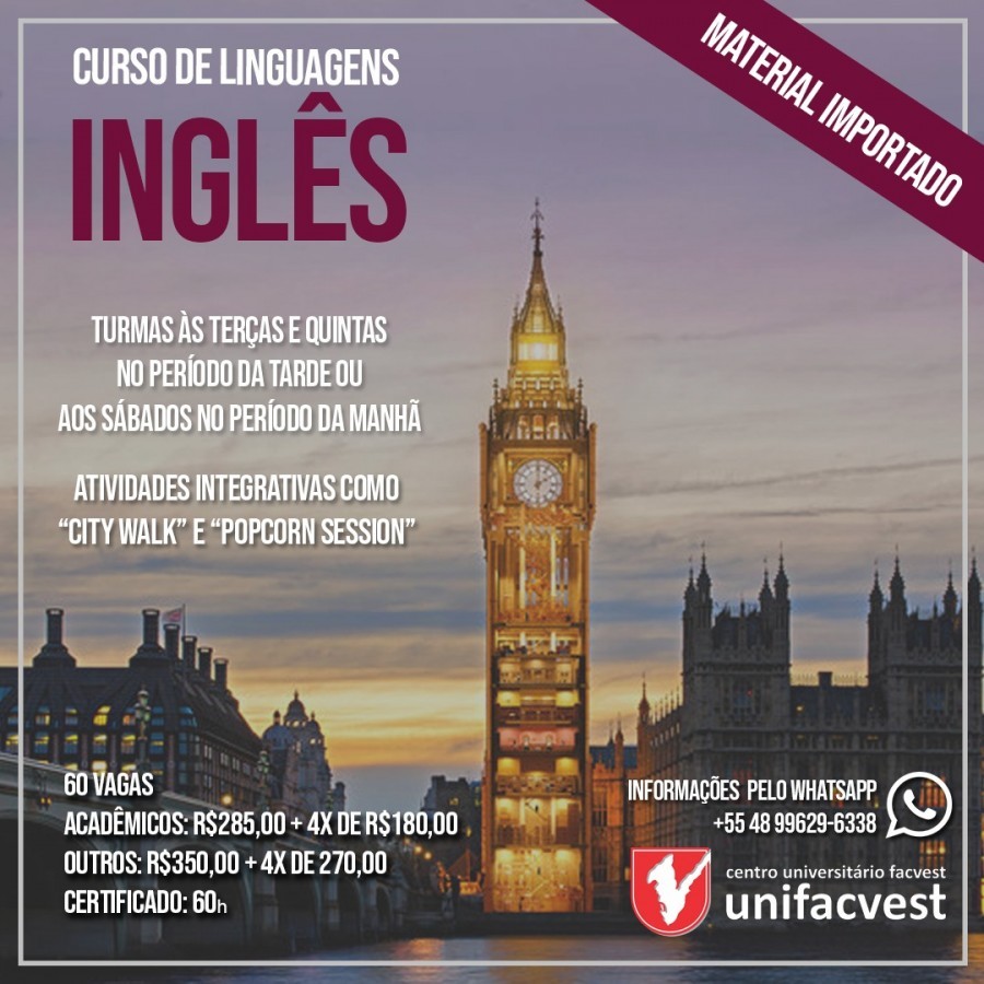 Conheça nossos cursos de línguas e faça já a sua matrícula. Material importado com preço de custo incluído na primeira mensalidade, exceto para Inglês Instrumental. Info pelo WPP +55 48 996 296 338 #VemPraUnifacvest Produção Unifacvest Press