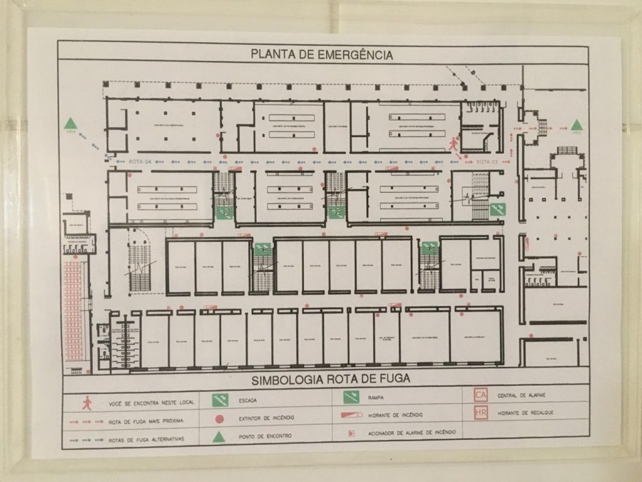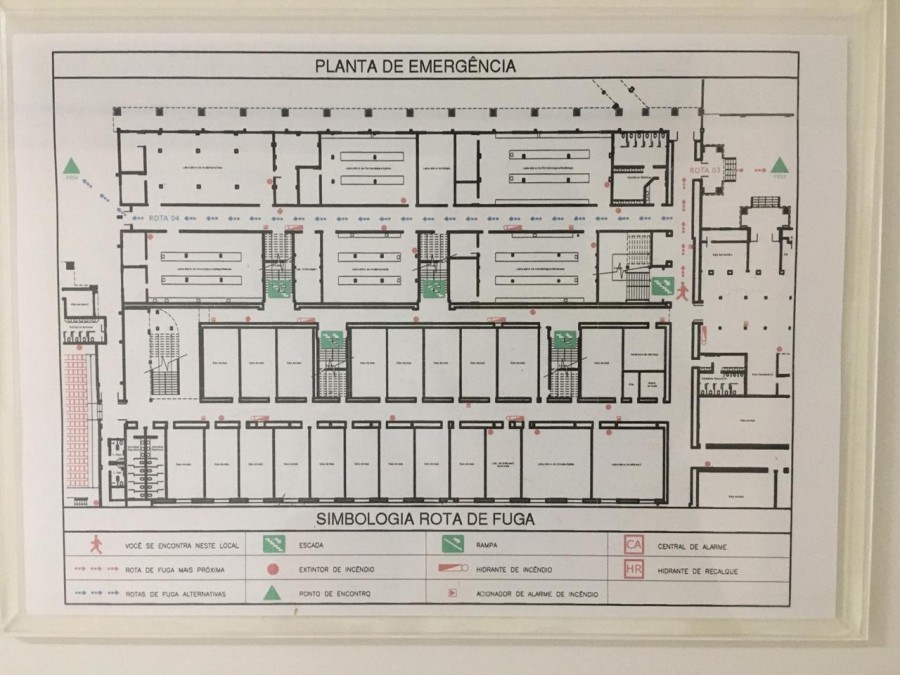 Nas salas localizadas nos andares acima do térreo, esta rota de fuga será direcionada à escada mais próxima. Ao pé da escada, outro mapa indicará a rota daquela escada até o ponto de encontro.