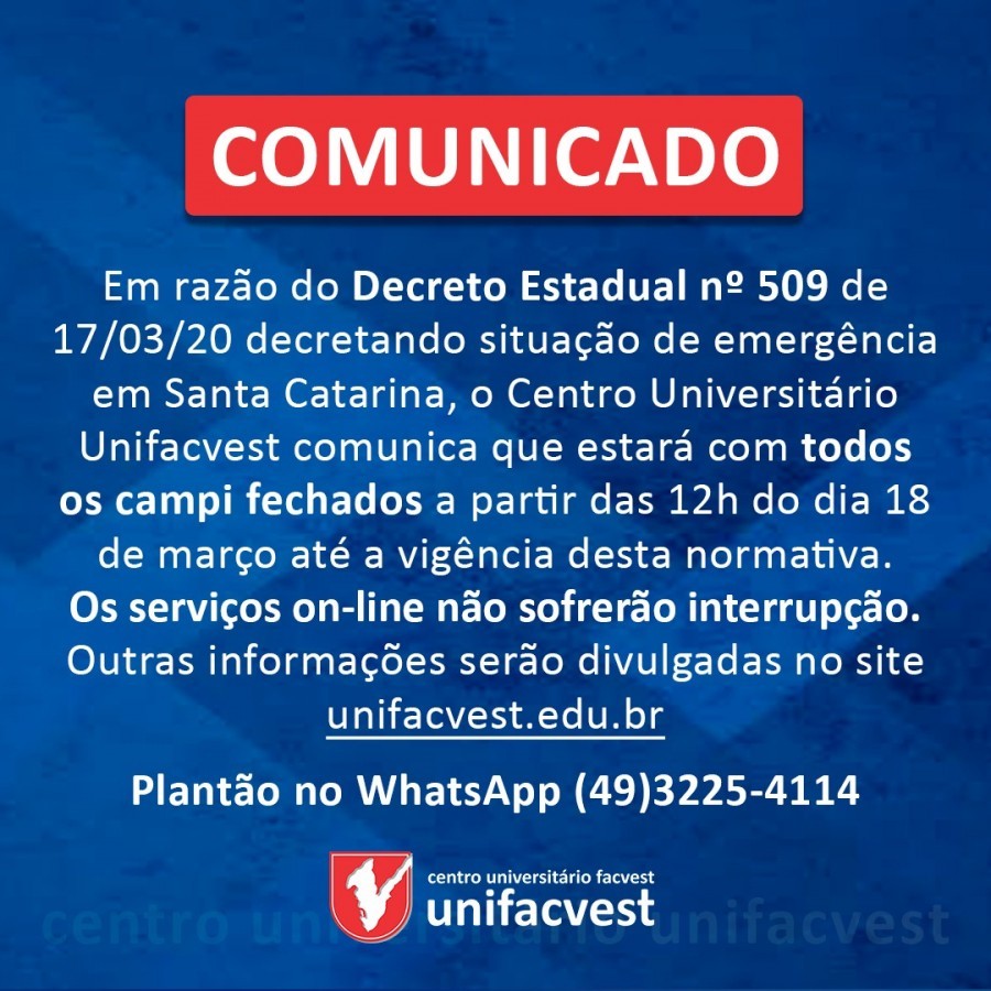 Em razão do Decreto Estadual nº 509 de 17.03.2020 que deflagra situação de emergência em Santa Catarina, o Centro Universitário Unifacavest comunica que estará com todos os campi fechados a partir das 12h do dia 18 de março até a vigência desta normativa. Os serviços on-line não sofrerão interrupção.
