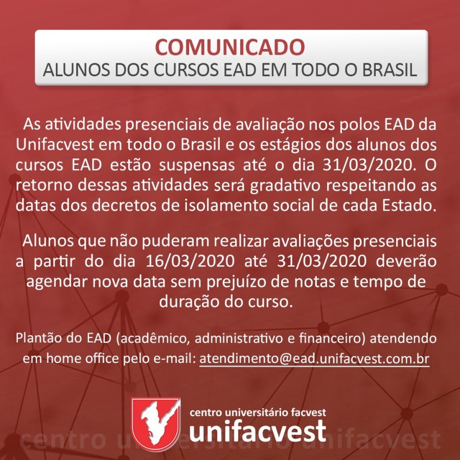 As atividades presenciais de avaliação nos polos EAD da Unifacvest em todo o Brasil e os estágios dos alunos dos cursos EAD estão suspensas até o dia 31/03/2020. O retorno dessas atividades será gradativo respeitando as datas dos decretos de isolamento social de cada Estado.