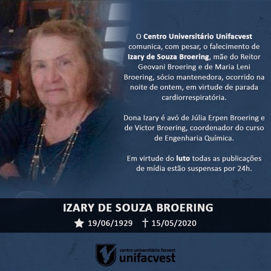 O Centro Universitário Unifacvest comunica, com pesar, o falecimento de Izary de Souza Broering (19/06/1929-14/05/2020), mãe do Reitor Geovani Broering e de Maria Leni Broering, sócio mantenedora, ocorrido na noite de ontem, em virtude de parada cardiorrespiratória.